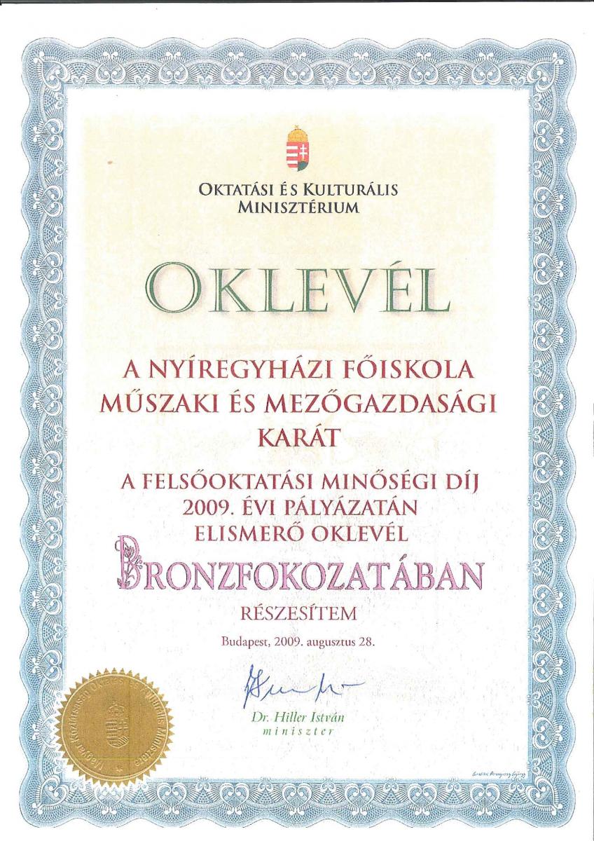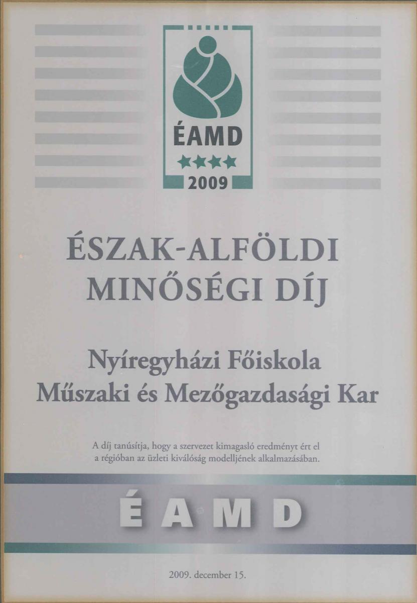 Az Intézet minőségirányítási rendszer működtetése és a folyamatos minőségfejlesztés eredményeként elnyerte a Felsőoktatási Minőségi Díj bronz fokozatát és az Észak-alföldi Minőségi Díjat.